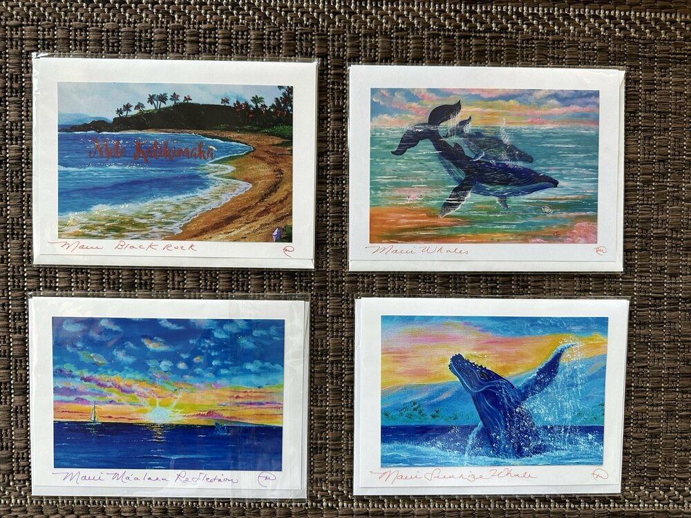Set of 4 Beautiful painted uniquely expressive greeting cards. Handcrafted with a touch of sparkle, love and Aloha. Made by Maui Sparkle, a local artist.