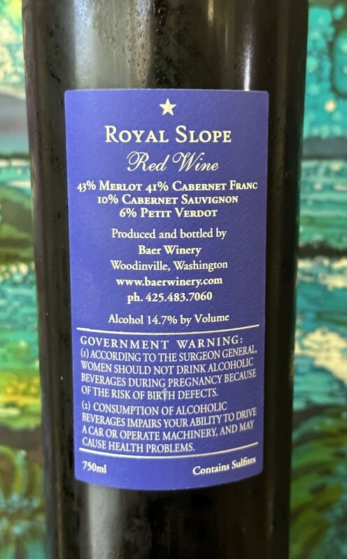 Royal Slope Red Wine. 43% Merlot, 14% Cabernet Franc, 10% Cabernet Sauvignon, 6%, Petit Verdot