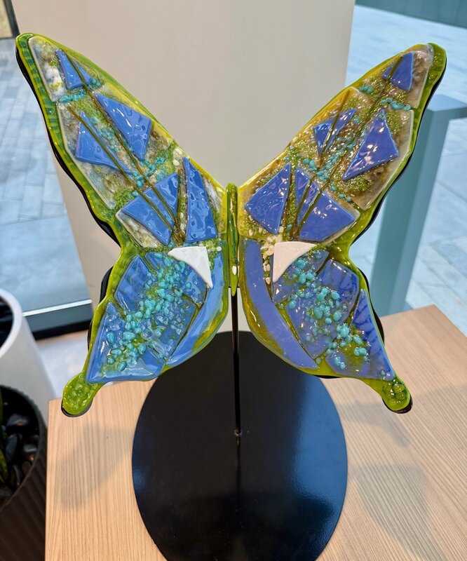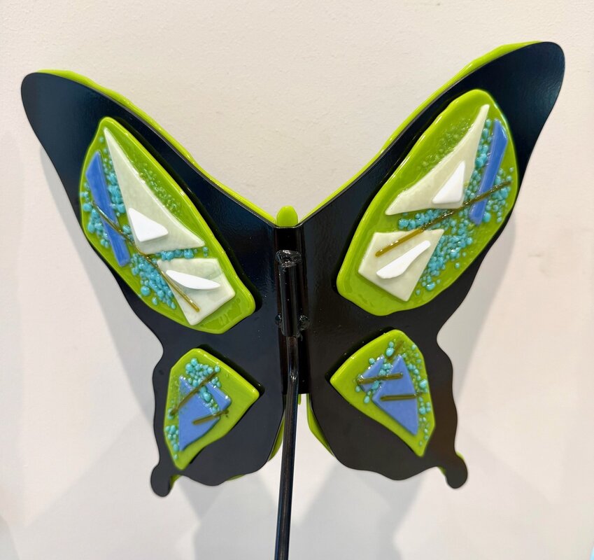 Intriguing transformations occur when glass softens and yields to the heat of the kiln. Butterflies are a symbol of change. When you make an art piece, materials transform into a new whole. The butterflies created for Take Flight 2026 are made of kiln-formed art glass on both sides. The fronts of the butterflies were made of glass pieces, frits and enamels that were then fired and fused into one piece of glass in a butterfly shape. The art glass was then applied to the metal frames. The back sides of the metal were ground and painted with translucent paints. Four individual butterfly sections were made of fired and fused art glass then applied onto the metal. Pat has been an artist for many years, working in a variety of materials from painting to metal to glass. Her journey with art glass began at a friend's hot shop, where she was able to blow glass and learn how to work with this engaging medium. She now works in metal and kiln formed glass (known as fused glass).