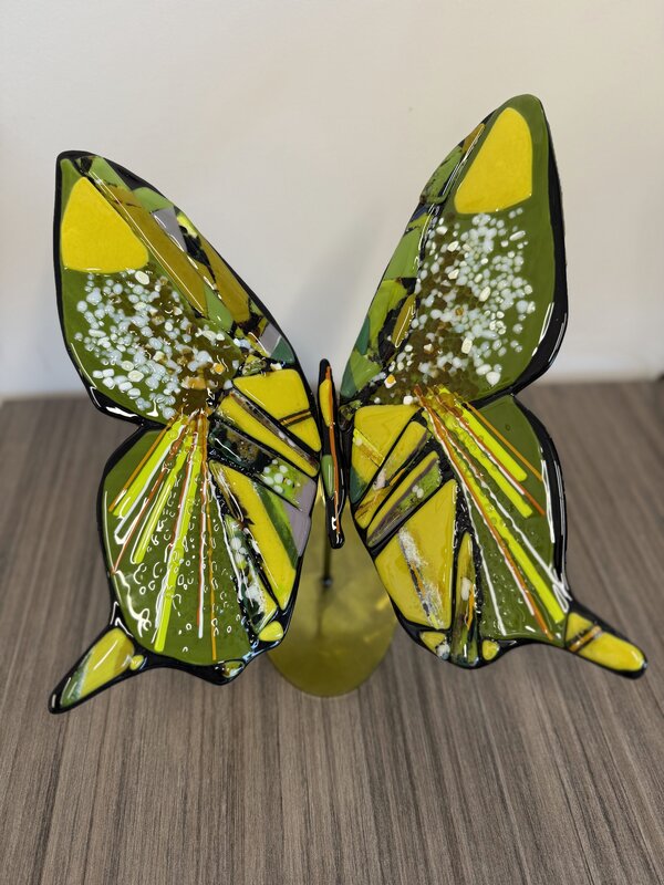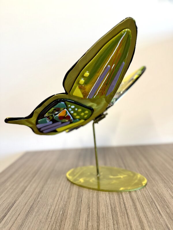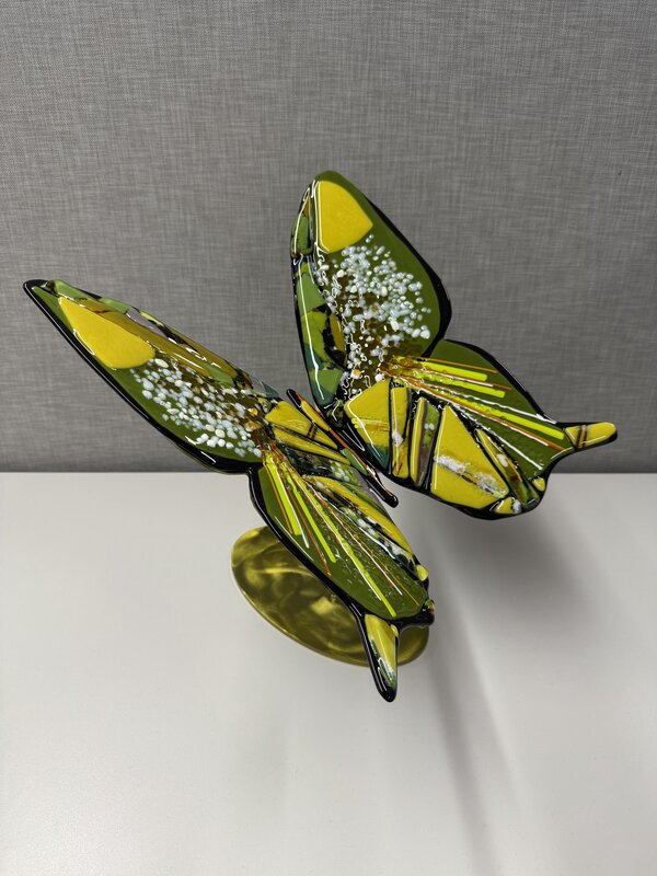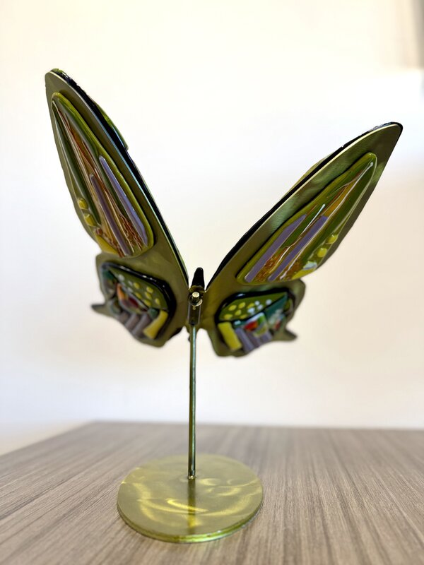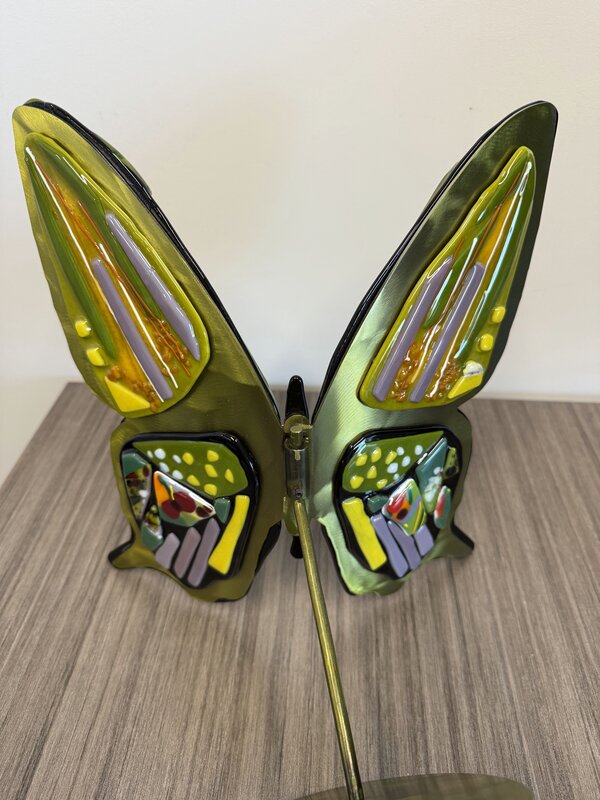 Butterflies are a symbol of change. When you make an art piece, materials transform into a new whole. The butterflies created for Take Flight 2024 are made of kiln-formed art glass on both sides. The fronts of the butterflies were made of glass pieces, frits and enamels that were then fired and fused into one piece of glass in a butterfly shape. The art glass was then applied to the metal frames. The back sides of the metal were ground and painted with translucent paints. Four individual butterfly sections were made of fired and fused art glass then applied onto the metal.