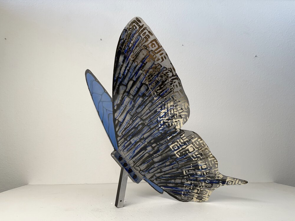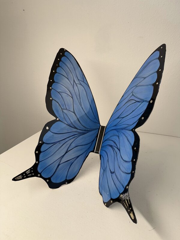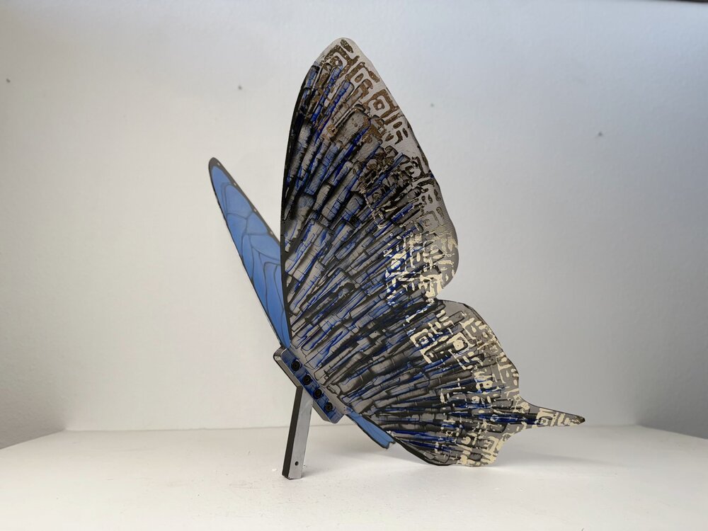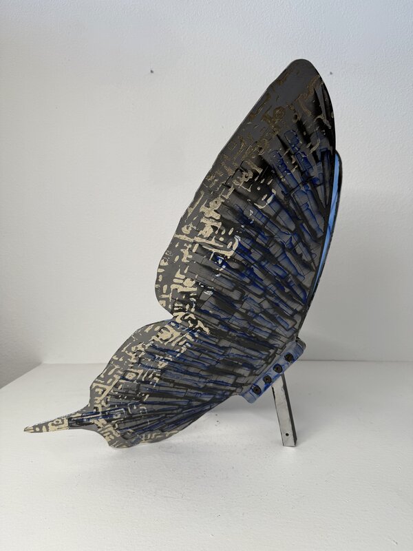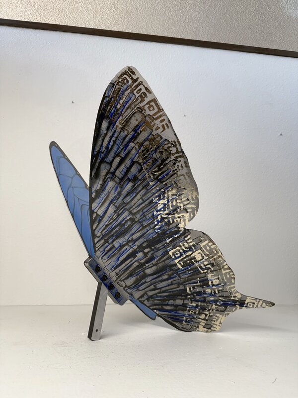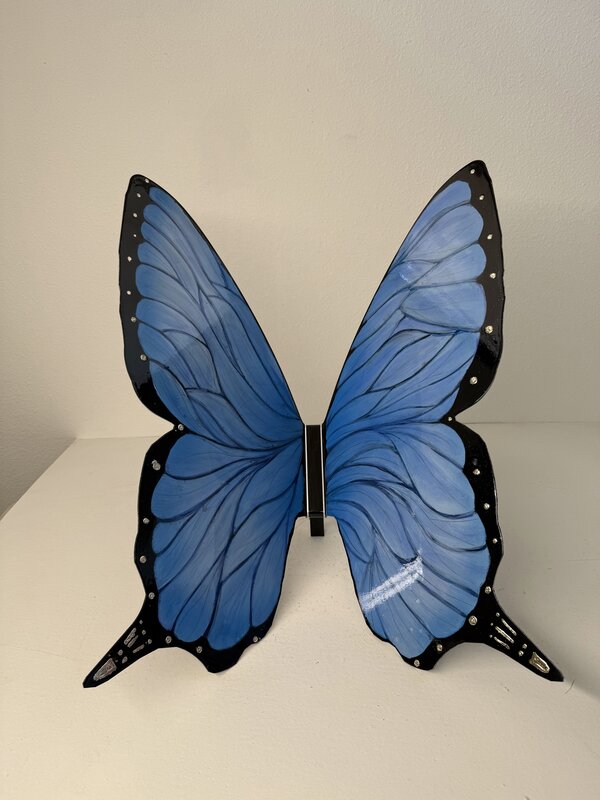 Inspired by a metaphor of two different styles quite similar but not quite the same, this butterfly represents two different techniques. The top color is golden, a little more realistic of what a butterfly would look like. "The bottom is more abstract and modern - It's more like my work a technique that I'm working on."