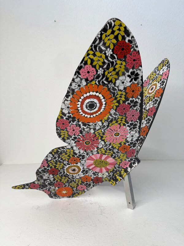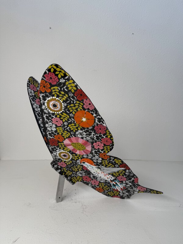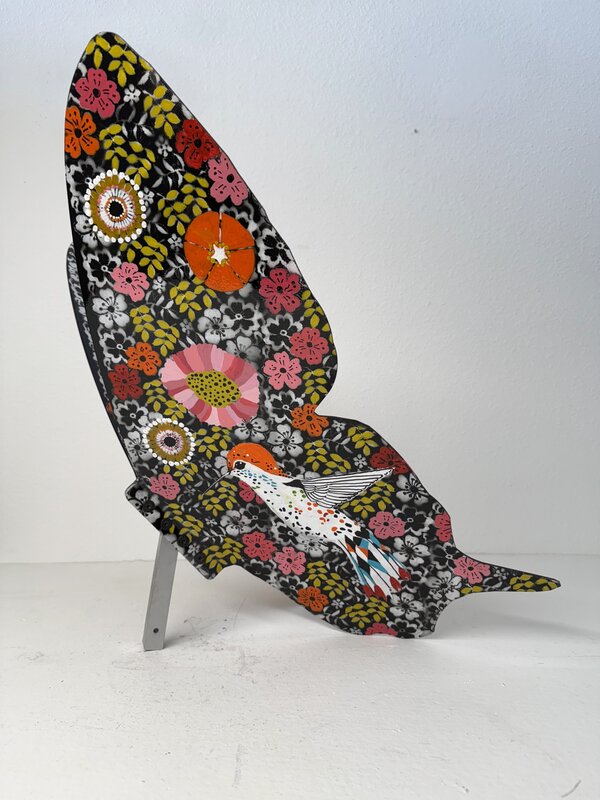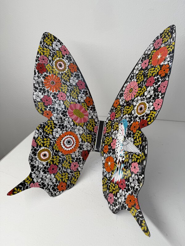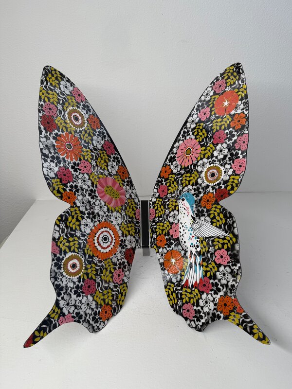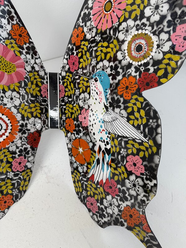 Barb was inspired by women's movement of the late 60's and early 70's. Flower Power. Both sides are painted in with a black lace detail and flowers highlighting a stylized hummingbird.