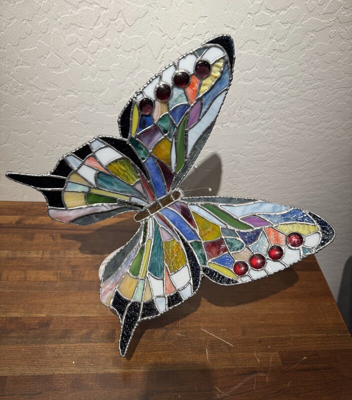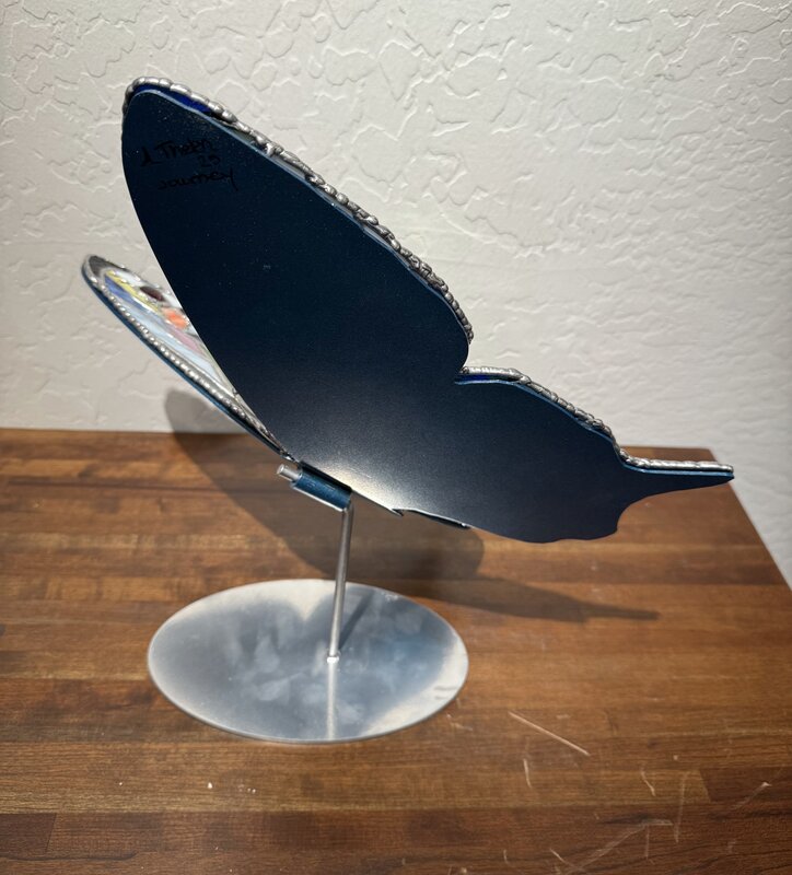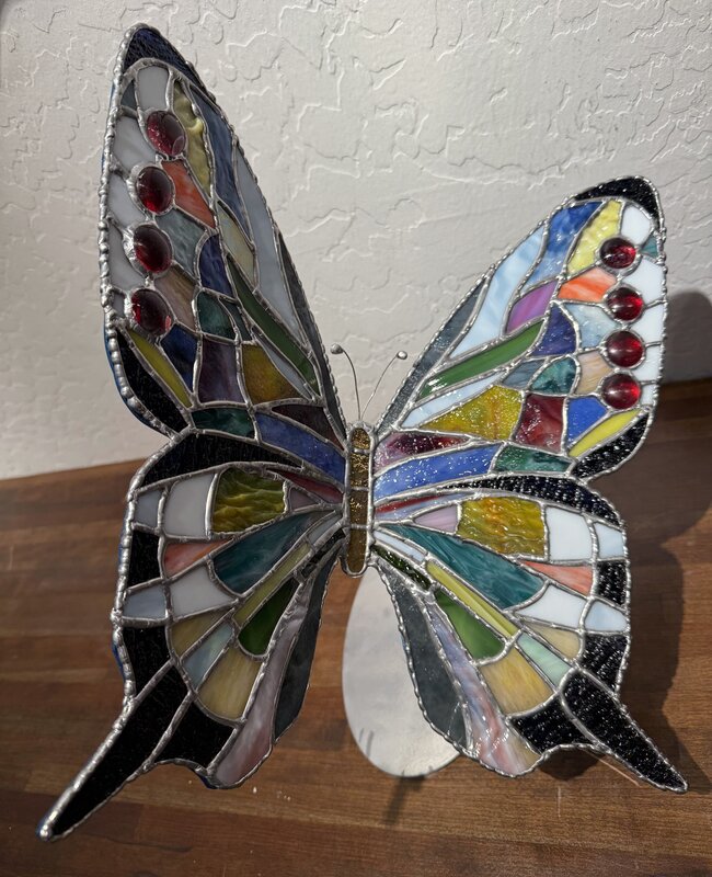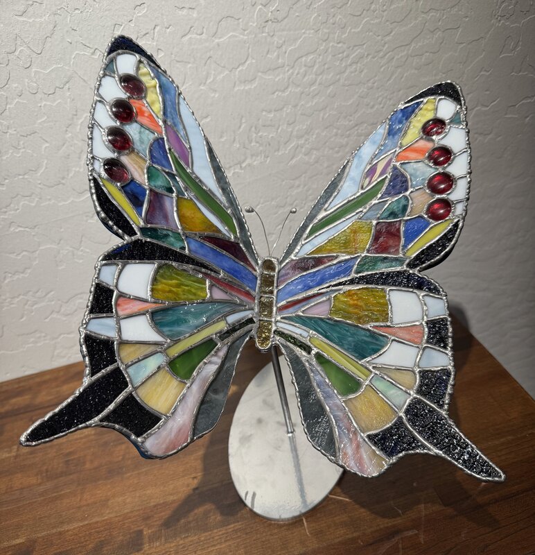 Inspired by the intrinsic beauty of butterflies. In awe of the long continuous journey made year after year. Stained glass: either fused or traditional stained glass with delightful colors that draw the viewers eye and powder coated steel. Annie has been doing stained glass for over 7 years. Most of her work is commissioned for individuals.