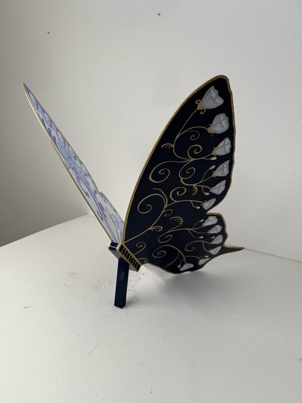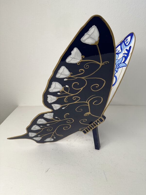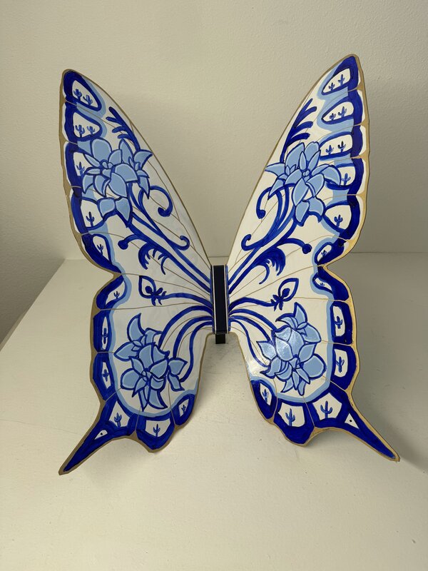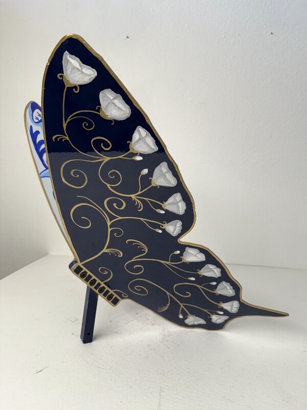 This metal butterfly sculpture, painted in a porcelain-inspired style, draws a parallel between the vibrant colors of butterflies and the bold indigo designs of blue and white porcelain. Just as a butterfly’s wings display striking contrasts, the blue hues on white porcelain symbolize how diverse elements within communities come together to create unity.