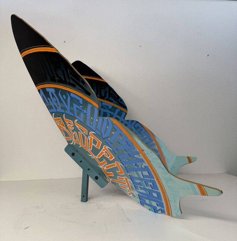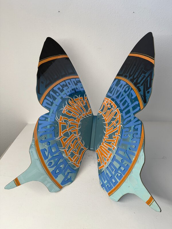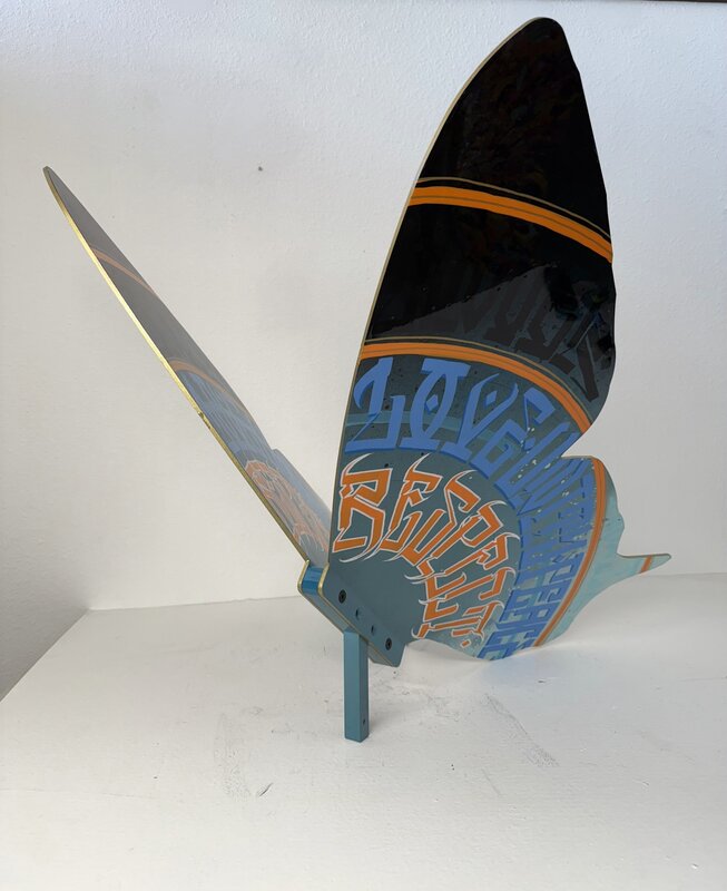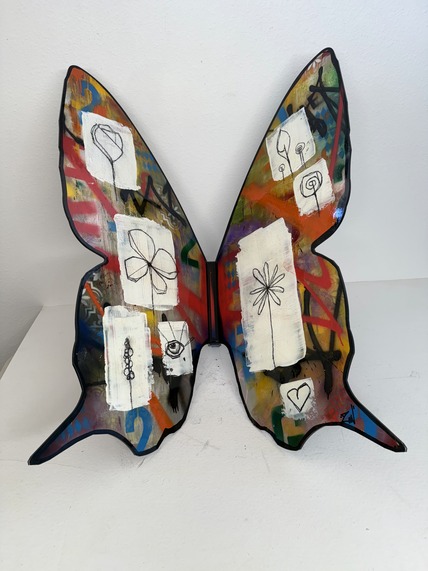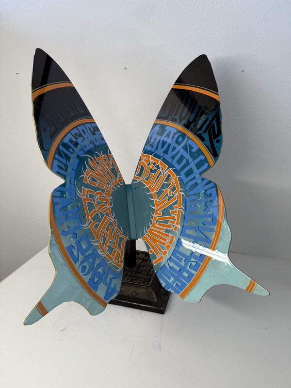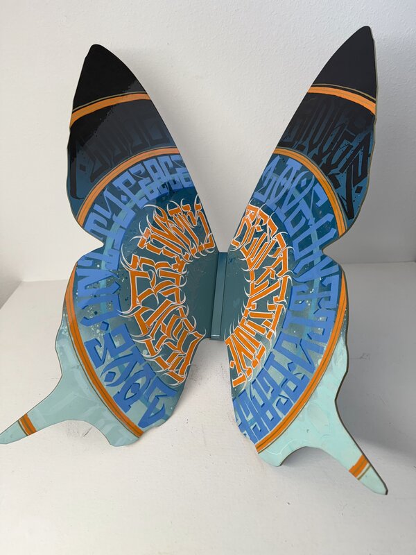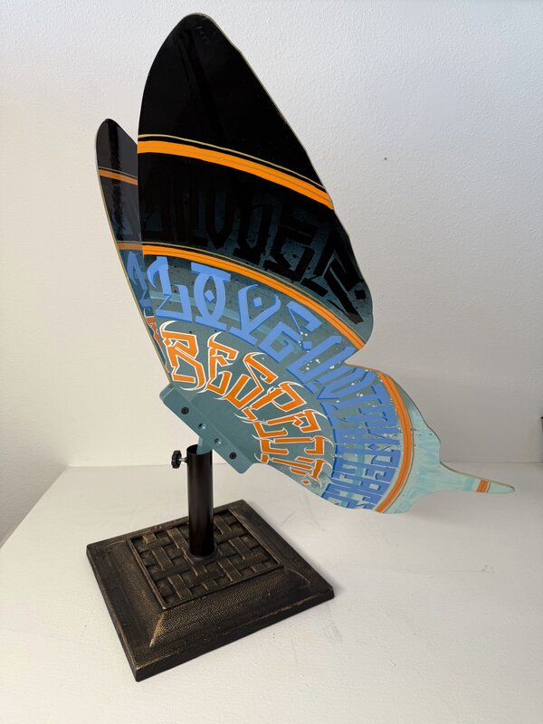 This piece features a series of interlocking rings, each inscribed with the words Hope, Love, Unity, and Respect, radiating outward as they push away the fading words Hate, Anxiety, Anger, and Spite. Painted on a large butterfly sculpture, it symbolizes both the freedom to rise high above negativity and the ripple effect of positive energies ability to move outward. In a time of uncertainty, where many forces seek to disrupt our peace, this piece serves as a visual reminder of the strength found in these simple yet powerful ideals.
