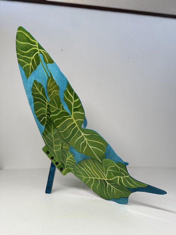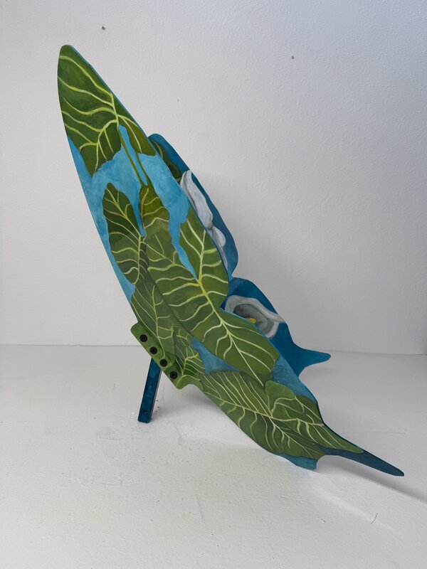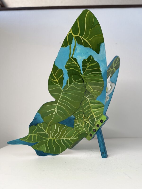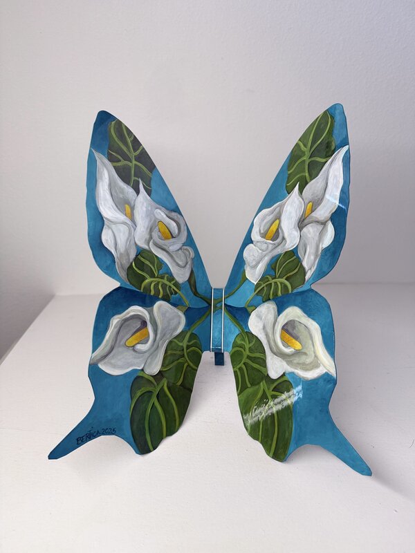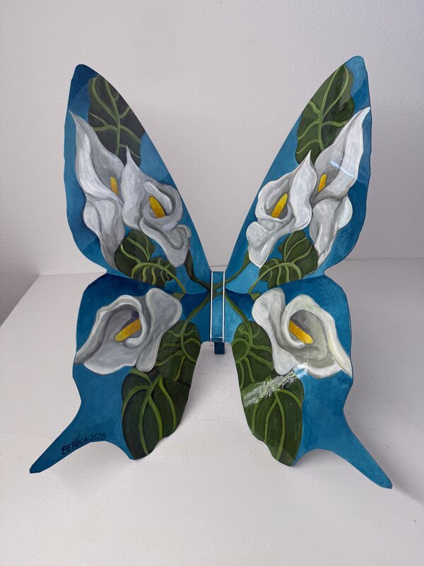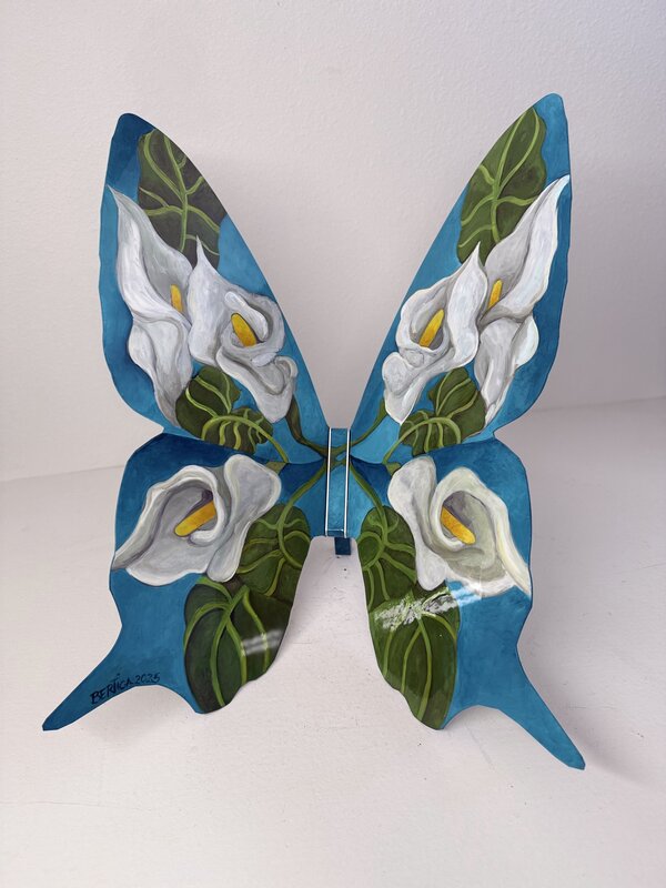 Bertica grew up in the Dominican Republic surrounded by tropical nature. As a little girl, she enjoyed going out in the rain and hiding under the plants - especially those with huge leaves. Although she considered all flowers to be beautiful, the Calla Lilly was especially interesting and graceful. In essence, its a single petal shaped into a funnel cone, balanced by it's long yellow spike. For some reason, it makes me think of a ballerina. Calla Lilly is known to symbolize beauty, purity, innocence, holiness and faithfulness. "Painted on the back of the butterfly is the Calla Lilly leaves seen from below with the sky in the background, this is what I loved looking at when I was little."