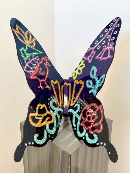 Inspired by the Pipevine Swallowtail Butterfly, this piece represents power from within as depicted by the saguaro cacti and celebrates transformation through a display of fireworks. The poisonous Pipevine Swallowtail symbolizes authenticity, standing out, and using one’s unique traits to survive. As a community of desert dwellers, we can all acknowledge the resilience of the life that resides here. In uplifting those around us and using our individual strengths, we have the ability to create lasting change and impact the world around us.