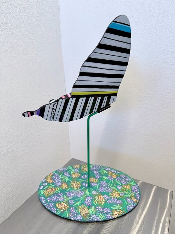 Inspired by the radiant colors of butterflies, and the quiet strength behind their beauty. Flowing lines and geometric structures represent the endurance, discipline, and resilience required for transformation while the base of flowers represents the natural forces that support and guide the butterfly along its path. The painted sculpture reflects the balance between fragility and strength, honoring the journey of becoming. Kara is originally from Michigan and has been a valley resident for over 20 years. She creates artwork that speaks volumes. Using vivid colors, layers, various shapes, and textures, she enjoys exploring the world of abstract and mixed media art. Her work is varied, complex, and evokes emotion. She was an exchange student through Rotary and admires their support and involvement in the community. www.karmajeanart.com