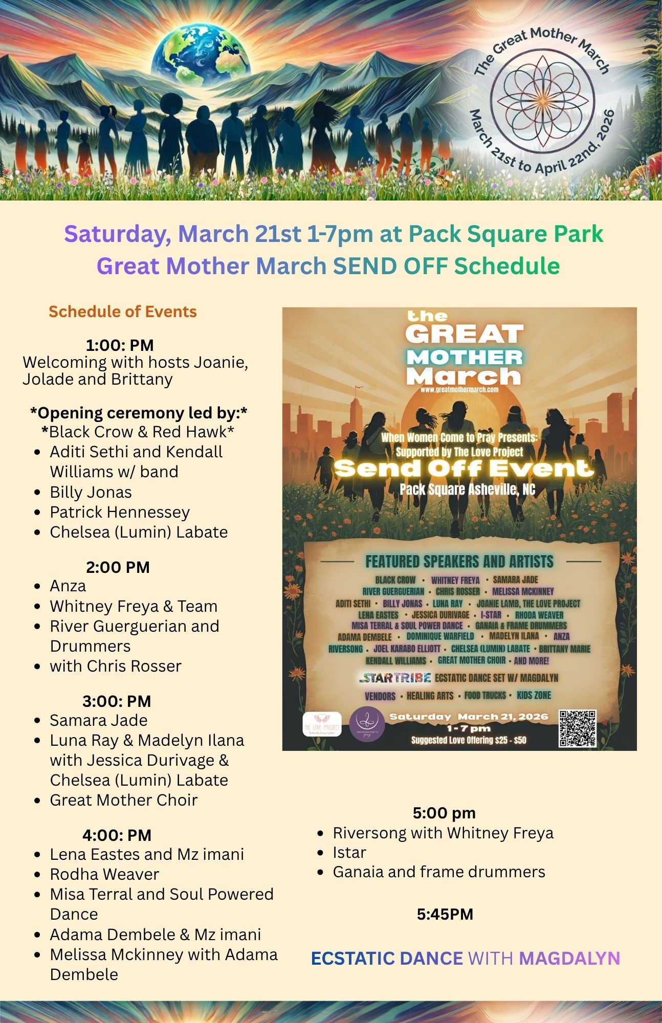 We invite you to a special Great Mother March Send Off Event on Saturday March 21st from 1:00 - 7:00pm at Pack Square Park in Asheville, North Carolina.