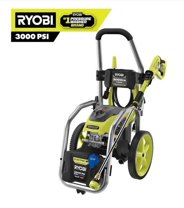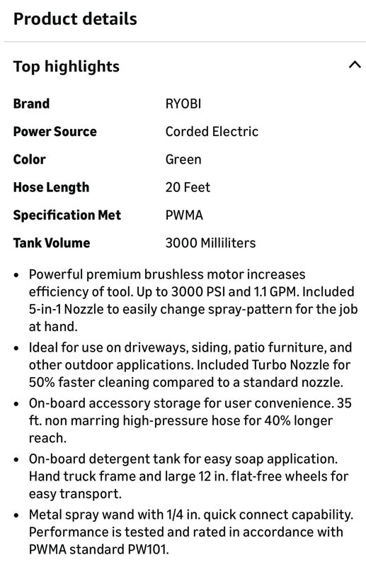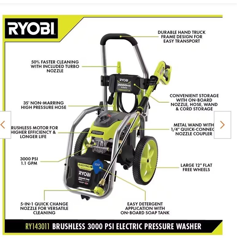 Powerful premium brushless motor increases efficiency of tool. Up to 3000 PSI and 1.1 GPM. Included 5-in-1 Nozzle to easily change spray-pattern for the job at hand. Ideal for use on driveways, siding, patio furniture, and other outdoor applications. Included Turbo Nozzle for 50% faster cleaning compared to a standard nozzle. On-board accessory storage for user convenience. 35 ft. non marring high-pressure hose for 40% longer reach. On-board detergent tank for easy soap application. Hand truck frame and large 12 in. flat-free wheels for easy transport. Metal spray wand with 1/4 in. quick connect capability. Performance is tested and rated in accordance with PWMA standard PW101.