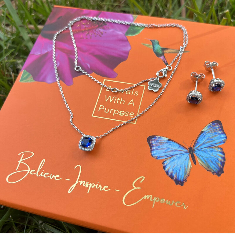 Add glamor to your day with these exquisite jewels! Beautifully designed in California and finely crafted in solid 925 sterling silver with gold overlay and the world’s most desirable simulated diamonds ever created! Hypoallergenic. The necklace measures 18 inches, with adjustable length. Lobster clasp. A signature camellia flower detail with the JWP logo complements this lovely piece. A beautiful array or clear zirconia adorn the post earrings and the stunning pendant. Outstanding packaging for gifting or to hold your keepsakes! Created exclusively for the philanthropic community.