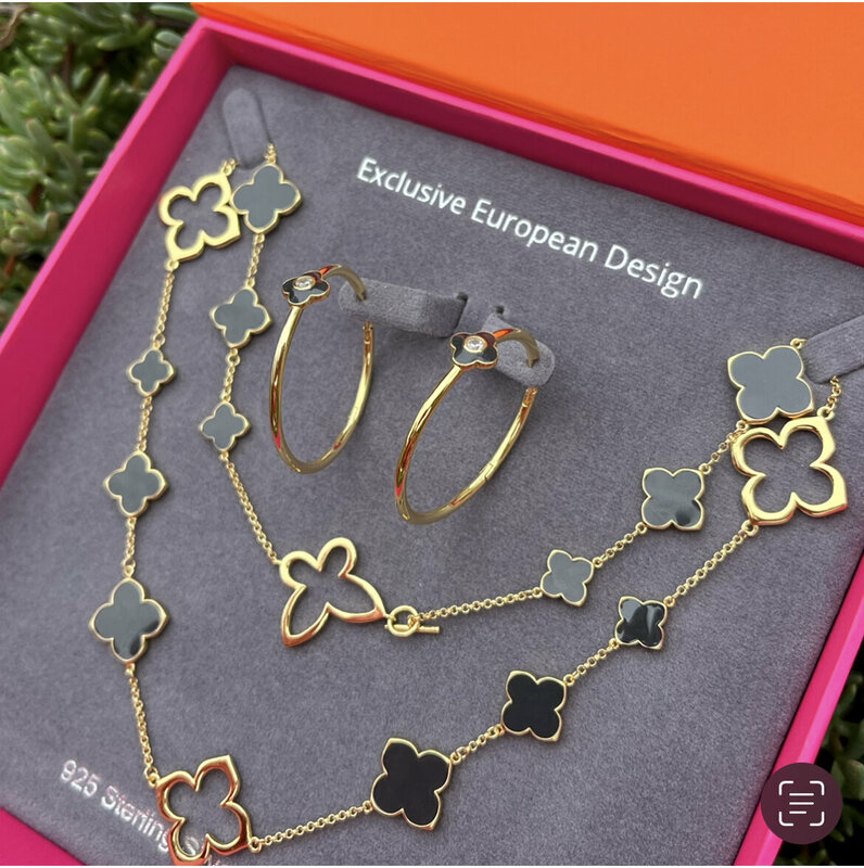 Black Flowers and Butterflies Necklace and Earrings in Yellow Gold