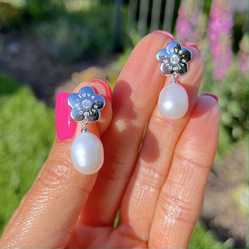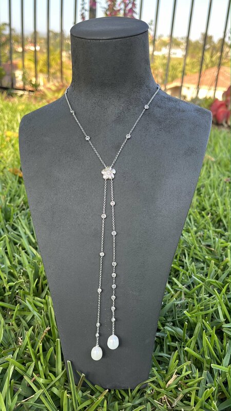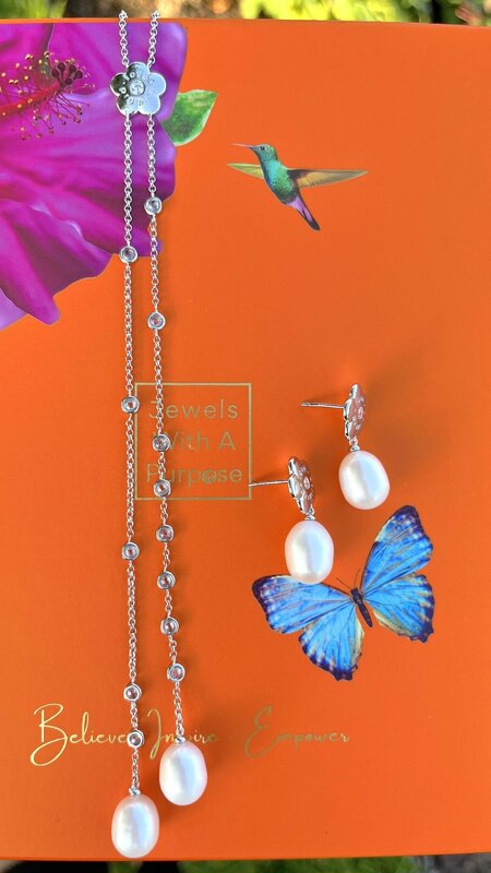 Make a statement in these exquisite jewels, beautifully designed in California and finely crafted with authentic fresh water pearls, in solid 925 sterling silver and world’s most desirable simulated diamonds ever created. Both the lariat and the earrings have a special “love promise” signature flower with a cross indent on the back, for protection. The necklace features an 18-inch chain around the neckline and the height is adjustable. The post earrings have safety backings with silicone inside, to keep them from moving. Outstanding packaging for gifting or to hold your keepsakes! Created exclusively for the philanthropic community.