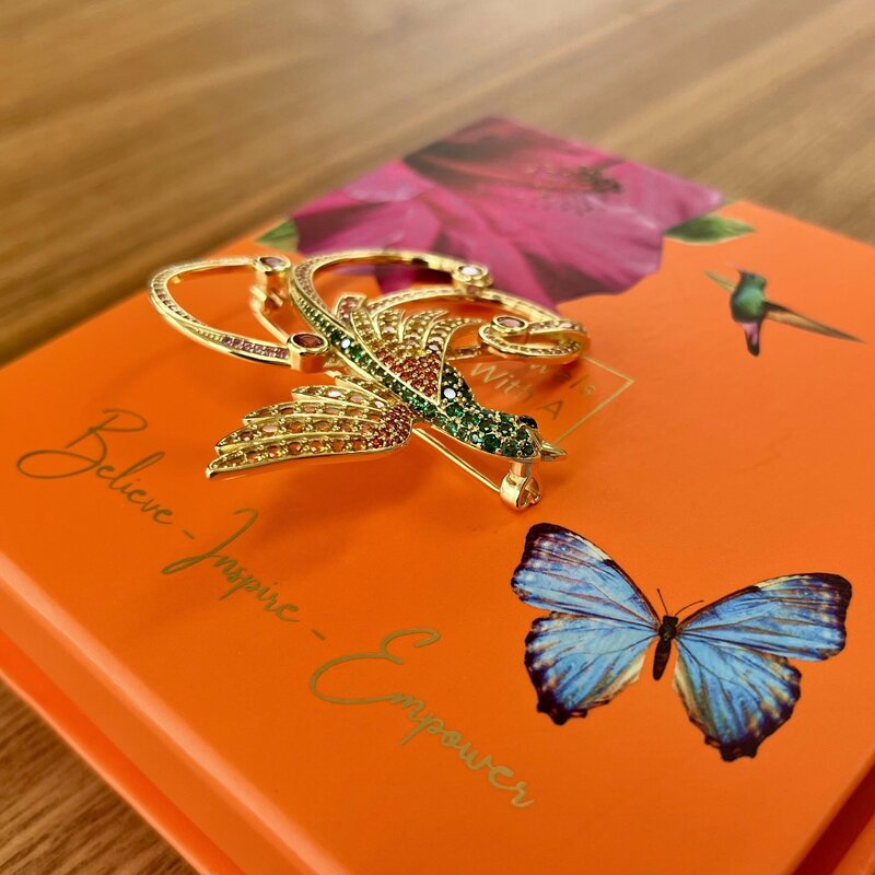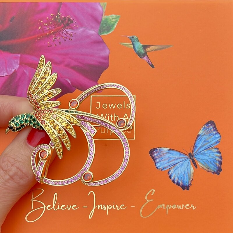 This fascinating pin brooch is made for the spotlight! Beautifully designed in California and finely crafted in solid 925 sterling silver. Striking the balance between dramatic and refined, it features and exquisite setting with an embellished array of world’s most desirable simulated pink and yellow sapphires, emeralds and citrine ever created. The pin is very durable, made of stainless steel, so it won’t bend. Outstanding packaging for gifting or to hold your keepsakes. Created exclusively for the philanthropic community!